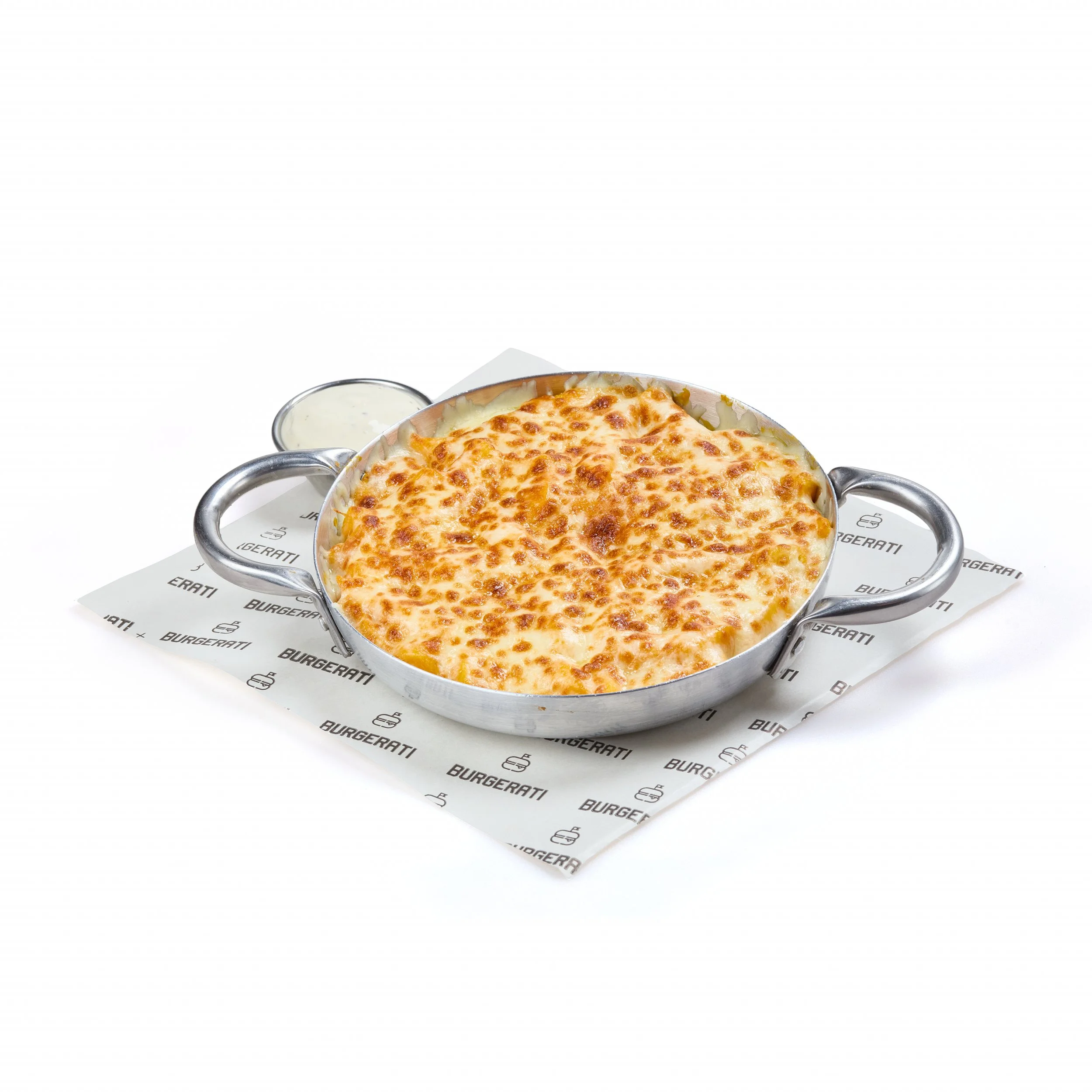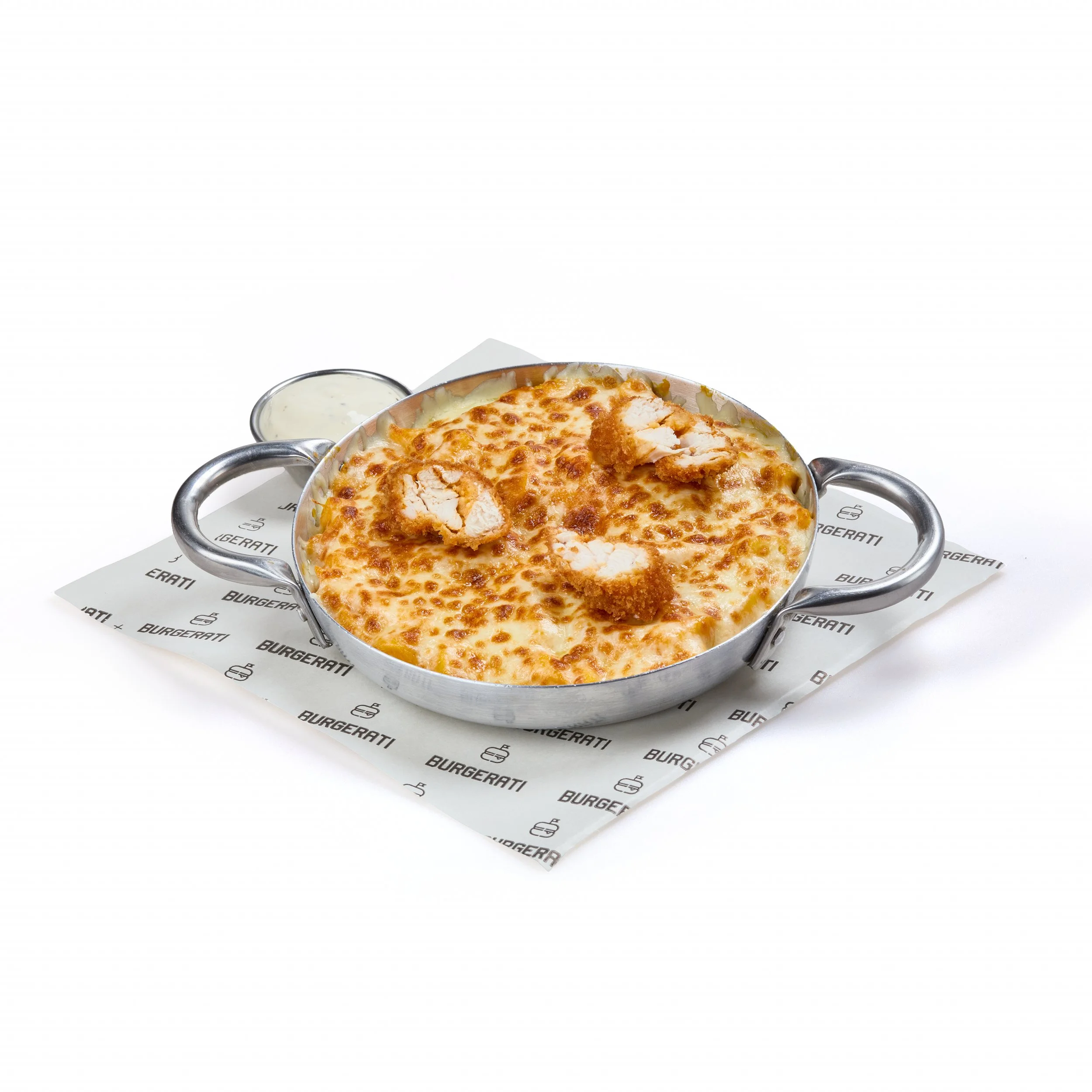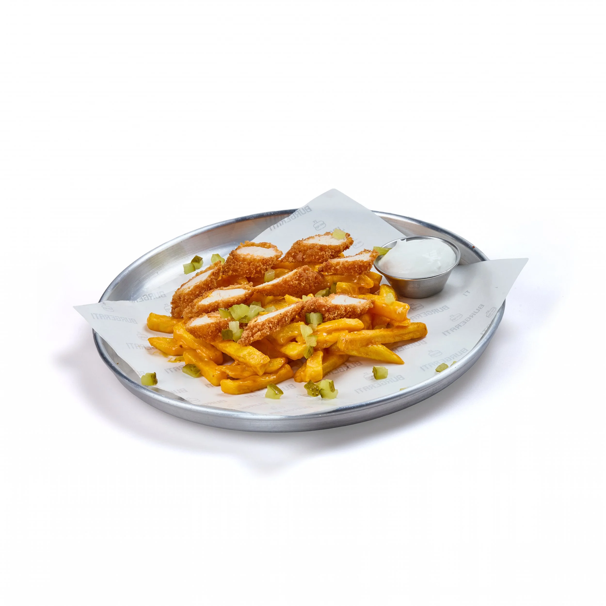 Fries topped with melted cheddar, chicken strips, buffalo spicy sauce sesame & pickles. Cartofi prajiti cu sos Cheddar, fasii de piept de pui, sos buffalo picant, susan si castraveti murati. (400 gr.)