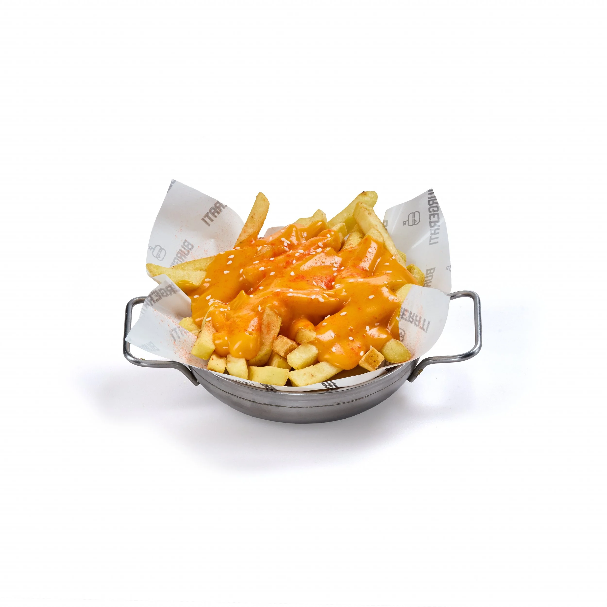 Fries, jalapenos, melted Cheddar cheese, condiments & sesame. Cartofi prajiti cu branza Cheddar topita, jalapenos, condimente si susan. (300 gr.)