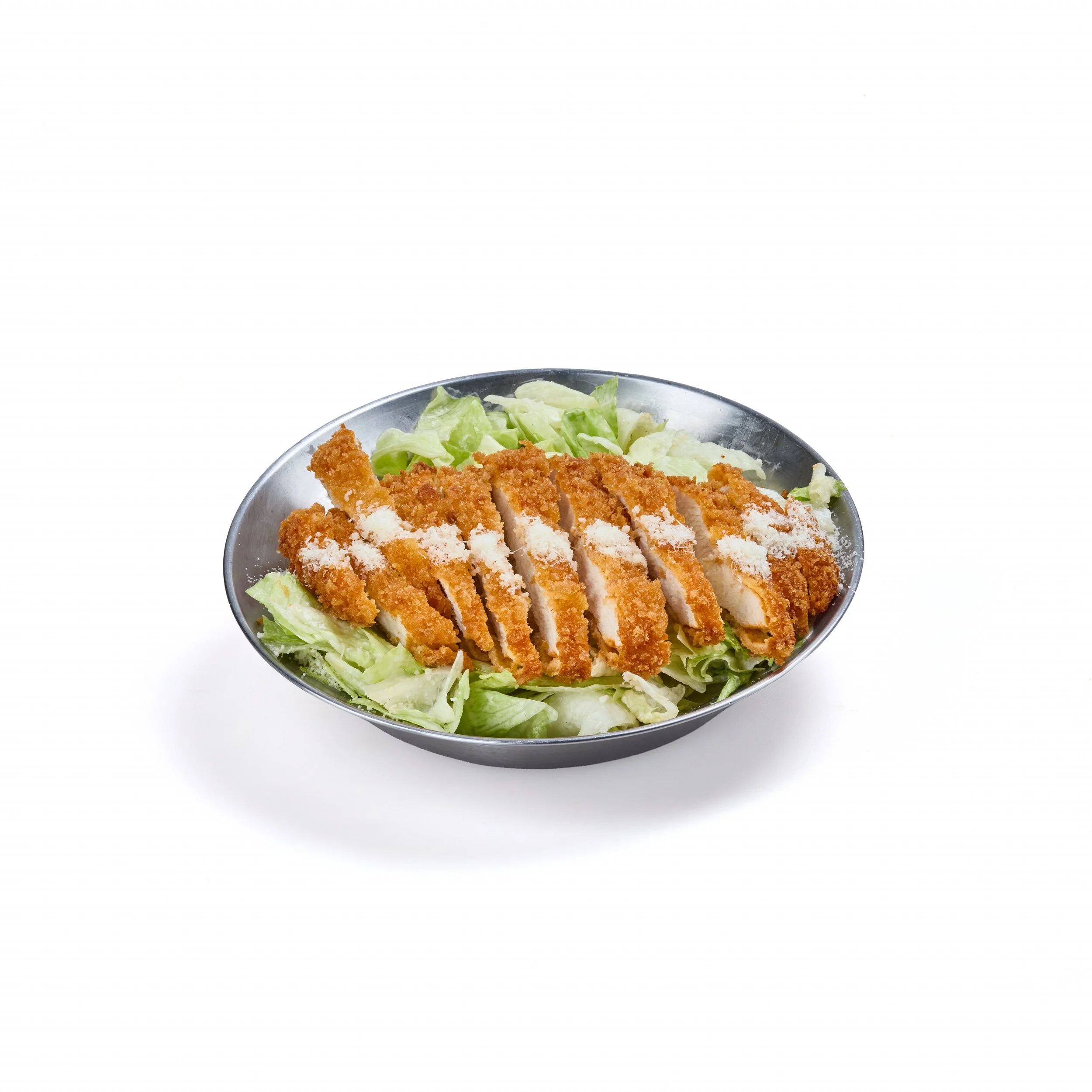 Iceberg salad with grilled or breaded chicken, parmesan(grana duro) & Caesar dressing. Salata Iceberg, carne de pui pe grill sau pane, parmezan (grana duro), cu sos Cezar. (350 gr.)